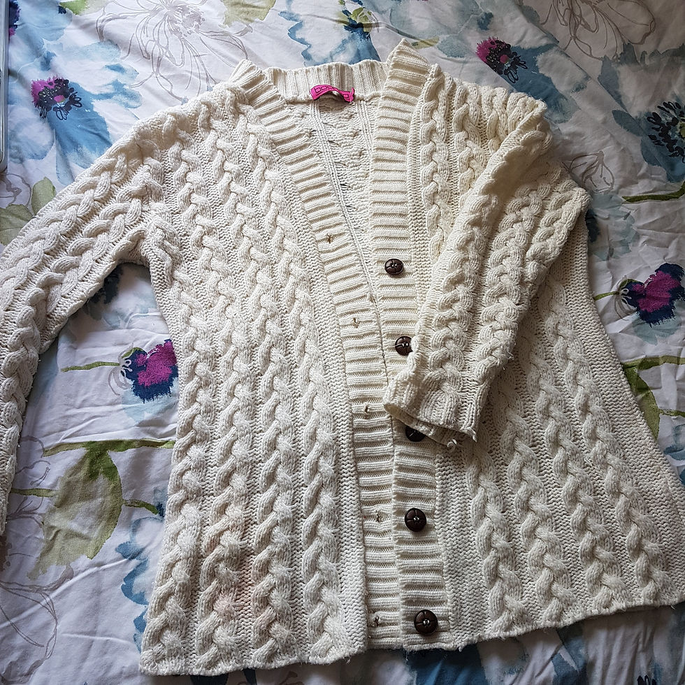 Find an old button down cardigan you are happy to cut up.This one had a large hole in the sleeve. Make sure there are no holes in the main body where you will be using the fabric. If there are hole in the section you want to use, make sure you patch this first.